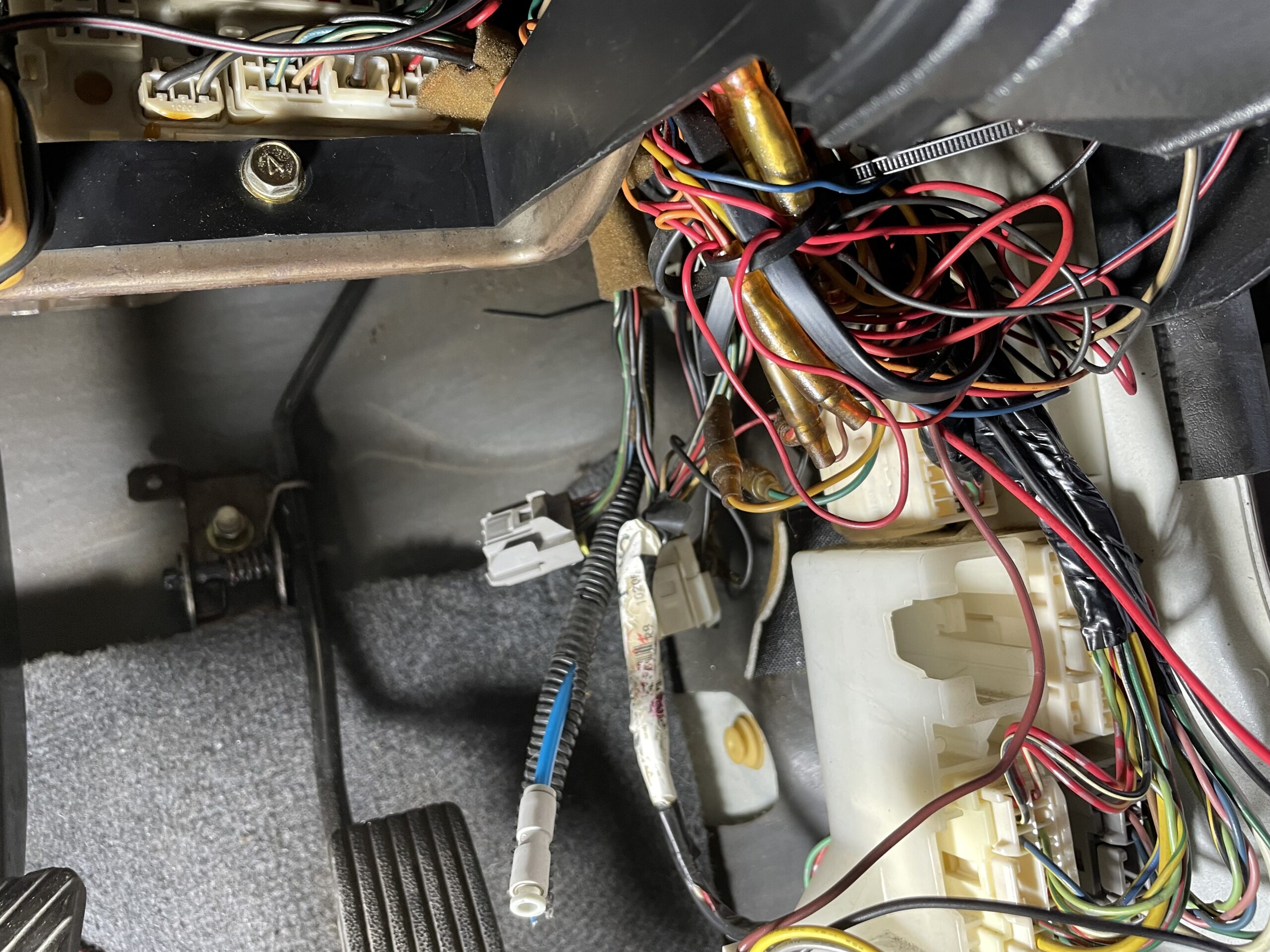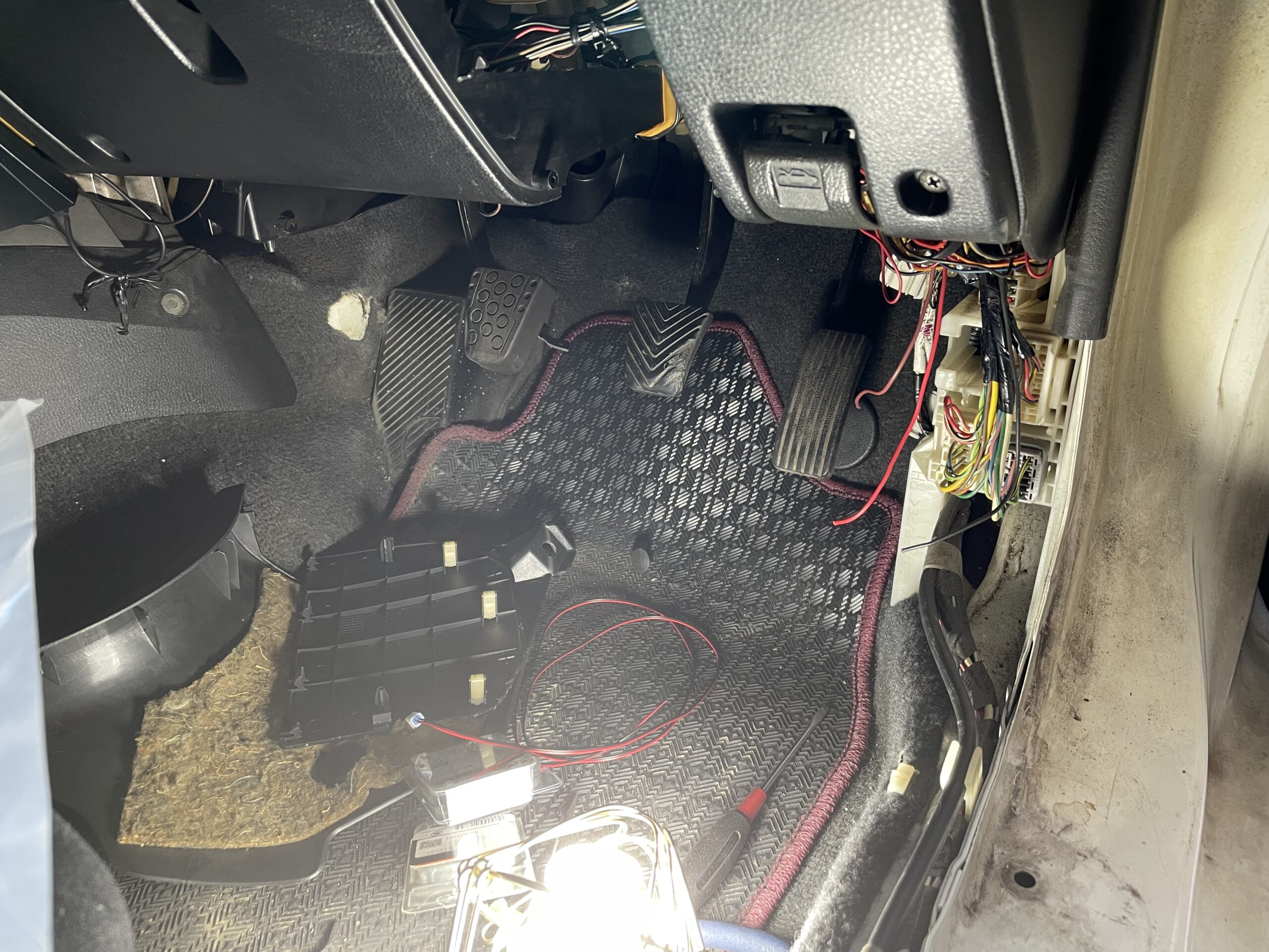 次は、エンジンルームに設置するコントールユニットの配線を、車内に引き込む。